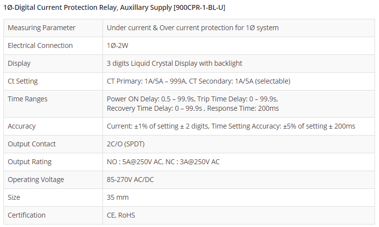 1Ø-Digital Current Protection Relay, Auxillary Supply 900CPR-1-BL-U