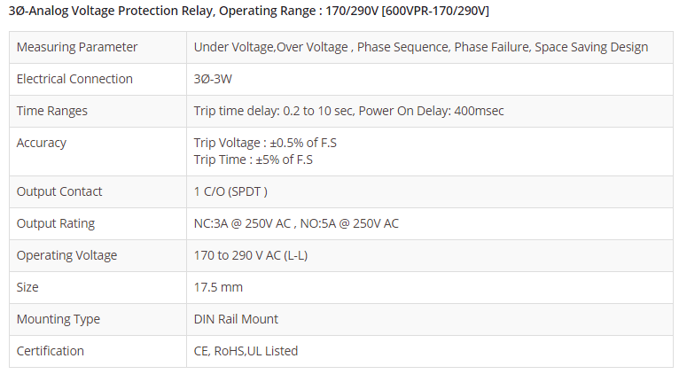 3Ø-Analog Voltage Protection Relay, Operating Range : 170/290V 600VPR-170/290V