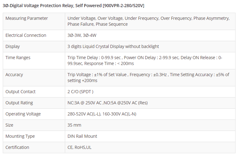 3Ø-Digital Voltage Protection Relay, Self Powered 900VPR-2-280/520V