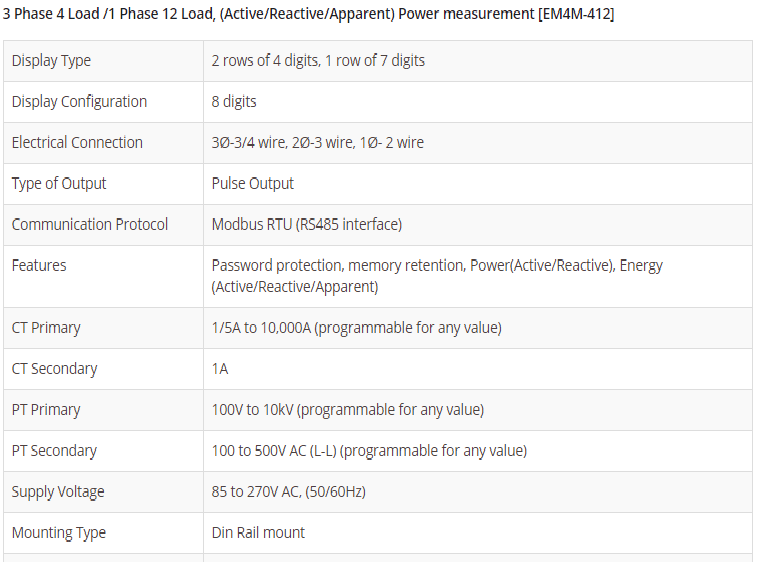 3 Phase 4 Load /1 Phase 12 Load, (Active/Reactive/Apparent) Power measurement [EM4M-412]