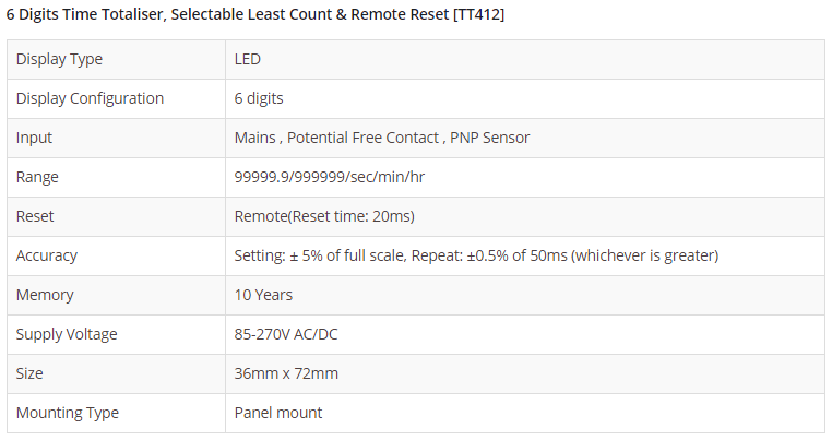 6 Digits Time Totaliser, Selectable Least Count & Remote Reset [TT412]