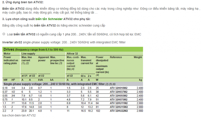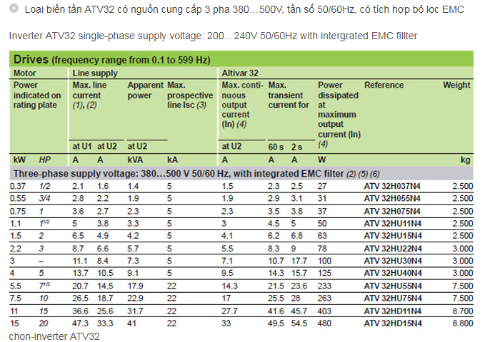 Biến tần Schneider (Techmecanique) ATV32 – inverter ATV 32 được hãng Electric Schneider thiết kế linh hoạt với dãy công suất từ 0.18…15Kw, kích thước gọn nhỏ có trọng lượng từ 2,4…8,8 Kg, dải tần từ 0.1…599Hz