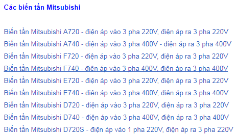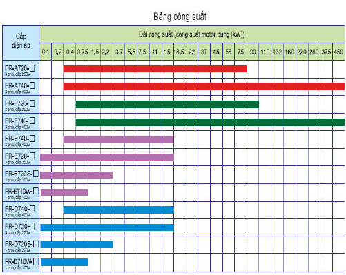Biến tần Mitsubishi FR-A740 sử dụng cho điện áp vào 3 pha 400V điện áp ra 3 pha 400V, dãy công suất từ 0.4kW đến 450kW. Thuộc dòng biến tần Mitsbishi A700. Đây là dòng biến tần mitsubishi cao cấp nhất.