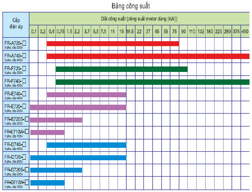 Biến tần dòng FR-D720 sử dụng cho điện áp vào 3pha 200V, ra 3 pha 200V. Thuộc dòng biến tần Mitsubishi D700. Biến tần tính năng trung bình và giá thành rẻ. Dãy công suất từ 0.1kW đến 15kW.