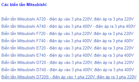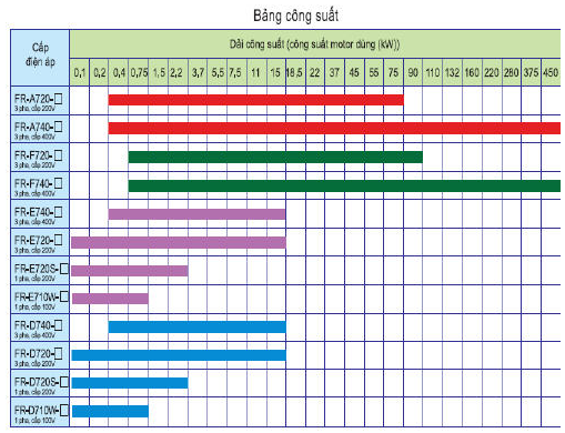 Biến tần dòng FR-E720 sử dụng cho điện áp vào 3pha 200V, ra 3 pha 200V. Biến tần tính năng trung bình và giá thành trung bình. Dãy công suất từ 0.1kW đến 15kW