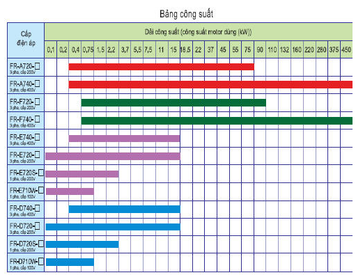 Biến tần dòng FR-f720 sử dụng cho điện áp vào 3pha 220V, ra 3 pha 220V. Thuộc dòng biến tần Mitsubishi F700. Biến tần tính năng cao và thiết kế nhỏ gọn. Dãy công suất từ 0.75kW đến 90kW.