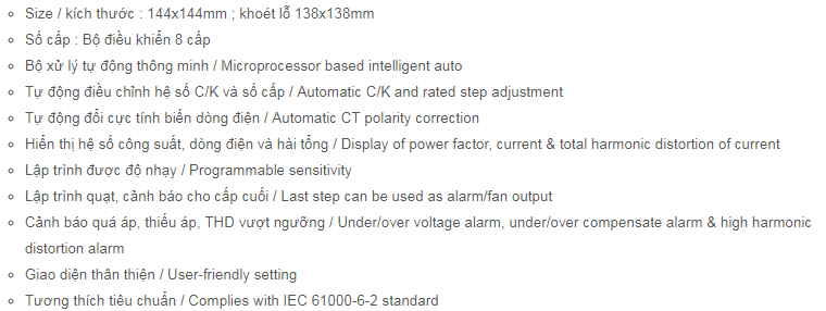 Bộ điều khiển tụ bù 8 cấp, cài đặt tự động, hoạt động tin cậy cao, đo THD, tiếp điểm alarm, quạt; kích thước : 144x144mm.