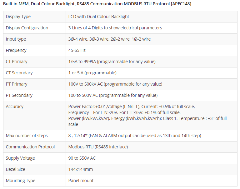 Built in MFM, Dual Colour Backlight, RS485 Communication MODBUS RTU Protocol [APFC148]