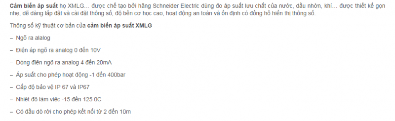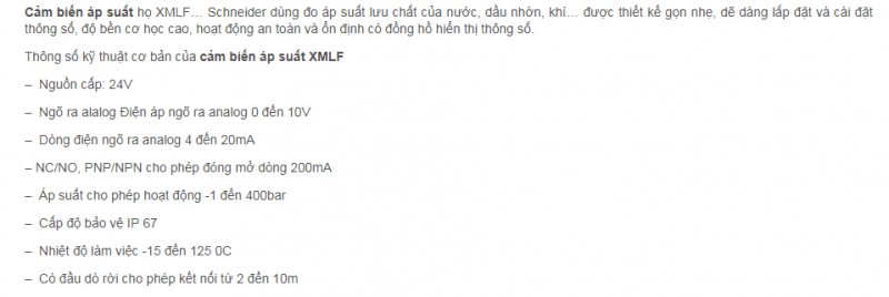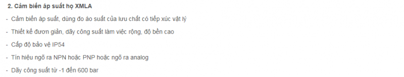 Cảm biến áp suất được chế tạo dùng đo áp suất lưu chất của nước, dầu nhờn, khí với kiểu dáng gọn nhẹ, phù hợp với nhiều nhu cầu, nhiều điều kiện lắp đặt, có dải đo áp suất rộng, ngõ ra linh hoạt (có thể tiếp điểm Relay, PNP/NPN, tín hiệu analog) cho phép kết nối với nhiều thiết bị giám sát và điều khiển khác