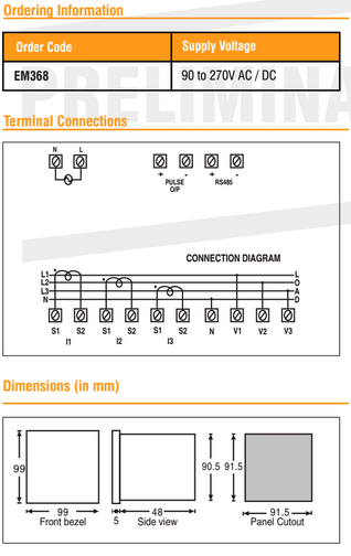 Đồng hồ đo năng lượng EM368 của Selec. Đo công suất tác dụng (active power kW); điện năng tác dụng (active energy kWh), công suất phản kháng (reactive energy kVAR) điện năng phản kháng (kVARh), điện năng biểu kiến (kVAh), hệ số công suất (cos phi), có khả năng lập trình hệ số biến dòng (CT), hệ số biến áp (PT), truyền thông RS485...