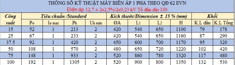 Máy Biến Áp Dầu 1 Pha Theo Qđ/62 EVN
