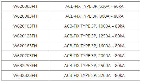 Máy cắt không khí (ACB), Aptômát hạ thế (MCB, MCCB), Contactor , Relay nhiệt. ACB 3 POLES, 4 POLE loại FIXED và DRAW OUT, từ 630A đến 6300A với các dòng cắt từ 65kA, 85kA, 100kA, 120kA.