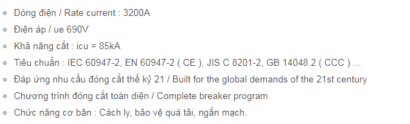 Máy cắt không khí AE3200-SW : 3200A, 85kA, đáp ứng tiêu chuẩn IEC, EN, JIS, GB.