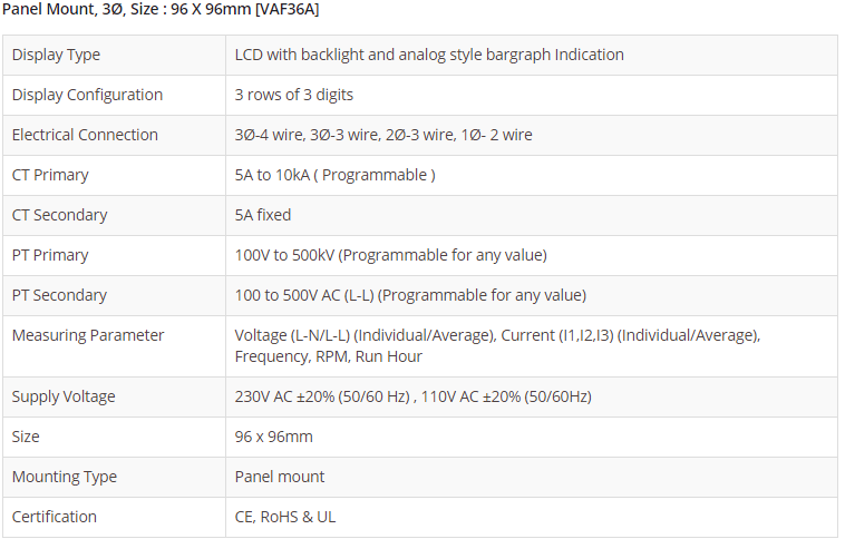 Panel Mount, 3Ø, Size : 96 X 96mm [VAF36A]