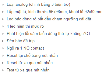 Relay bảo vệ dòng rò của Mikro (Malaysia), loại analog, Ngưỡng dòng rò 30mA - 30A, thời gian 0-3 giây, 4 led hiển thị % dòng rò. Test từ xa và reset từ xa.