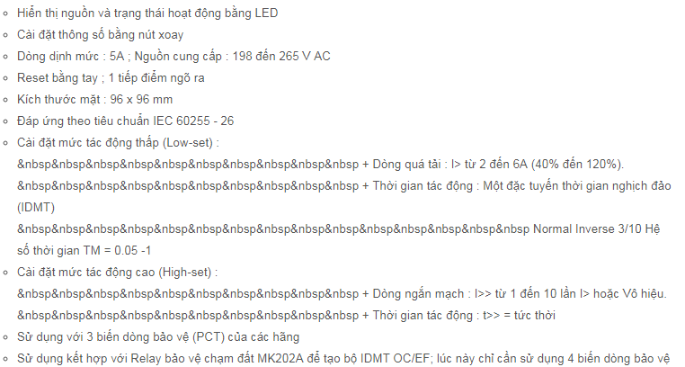 Relay bảo vệ quá dòng (over current relay) của Mikro (Malaysia), đặc tính bảo vệ IDMT, được sử dụng rộng rãi trong hệ thống điện công nghiệp. Sử dụng kết hợp với PCT của các hãng.