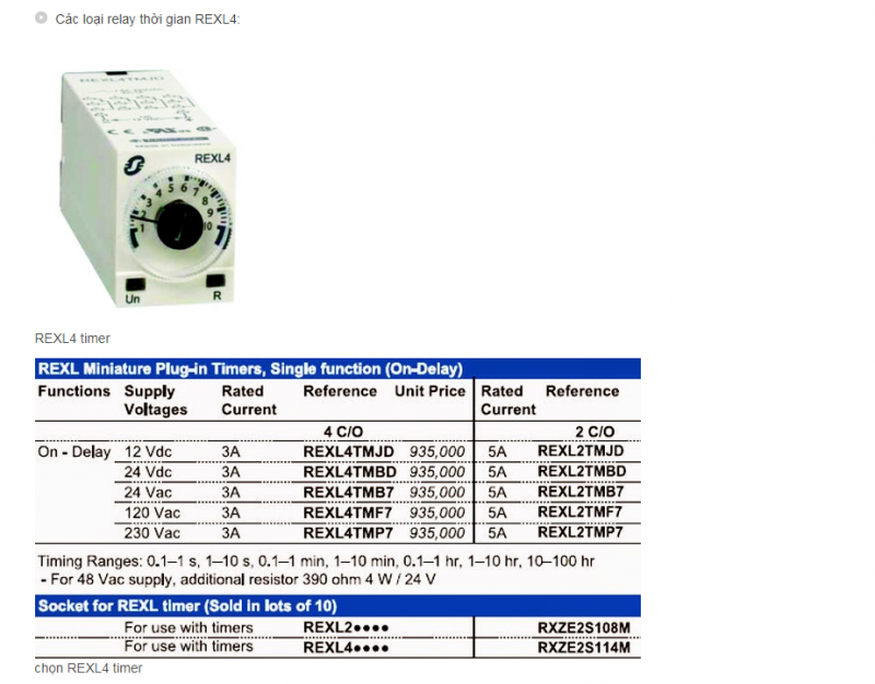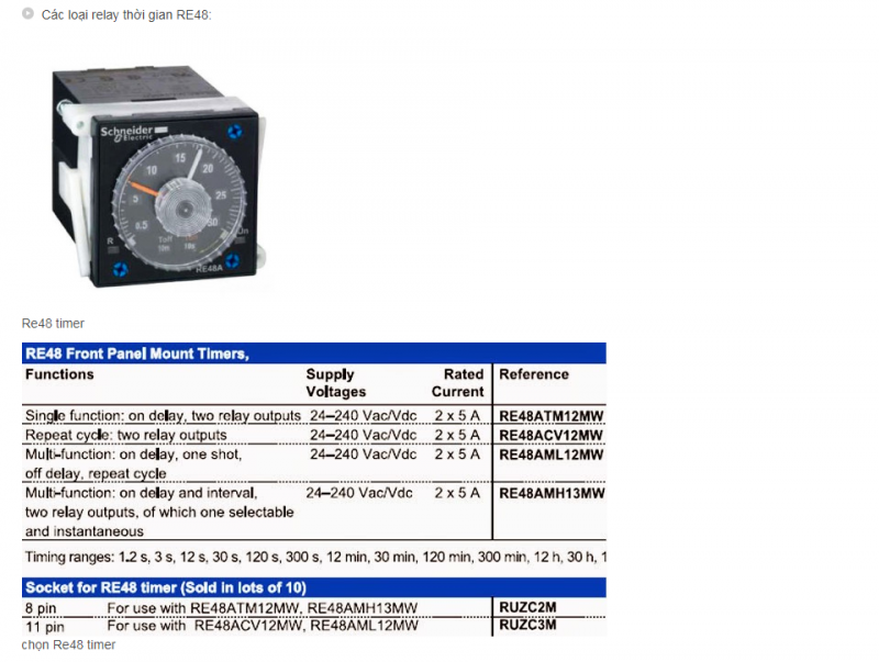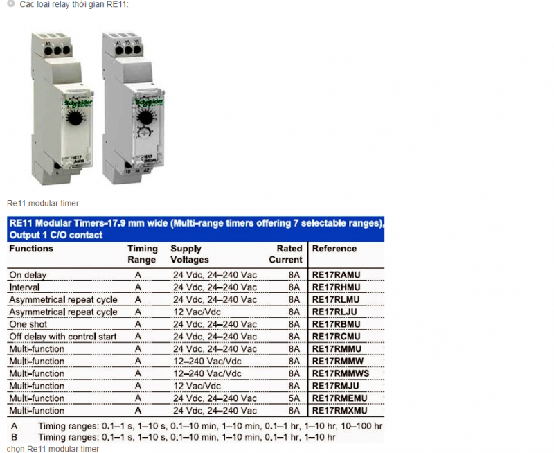Schneider cung cấp nhiều loại timer, on/off delay với khoảng thời gian định thời tương đối rộng từ 0.05s đến 300h, tiếp điểm C/O chiụ được dòng đến 8A, nguồn nuôi có nhiều lựa chọn, từ 24…380VAC, 24…240VDC